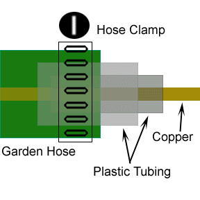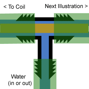 For an explanation why water dosen't spray out around the copper tubing on the "non-coil" side, take a look at the next illustration. Also I don't show the hoseclamps that hold the garden hose on at each "T" junction.